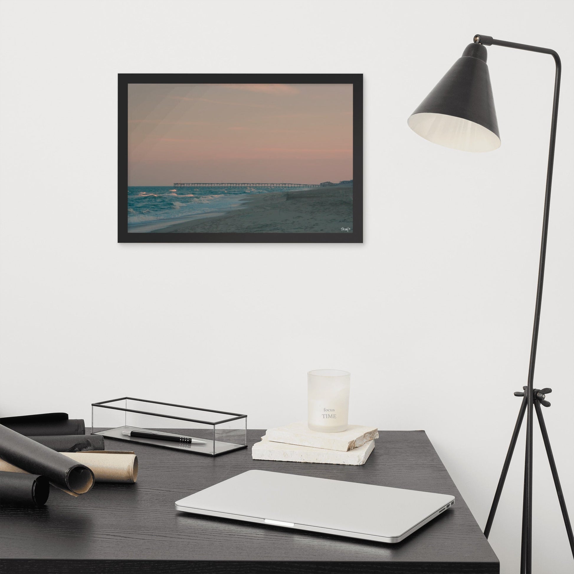 Obscura captures the shoreline just before nightfall—where pastel skies melt into the horizon and distant silhouettes blur in the salt-washed dusk. A long, narrow pier stretches far into the twilight tide, drawing the eye toward the unknown with quiet intention. This print evokes a sense of solitude, mystery, and infinite calm.