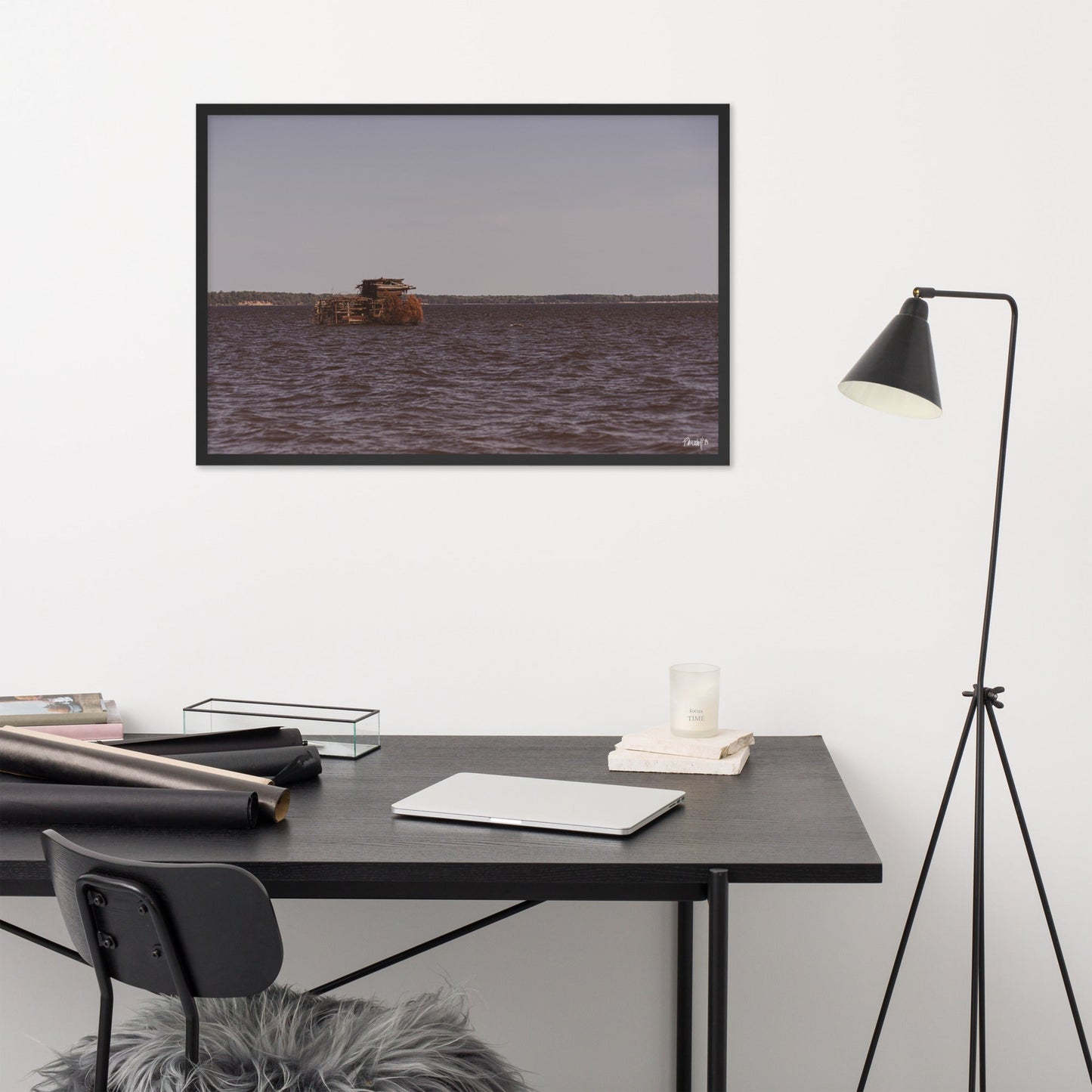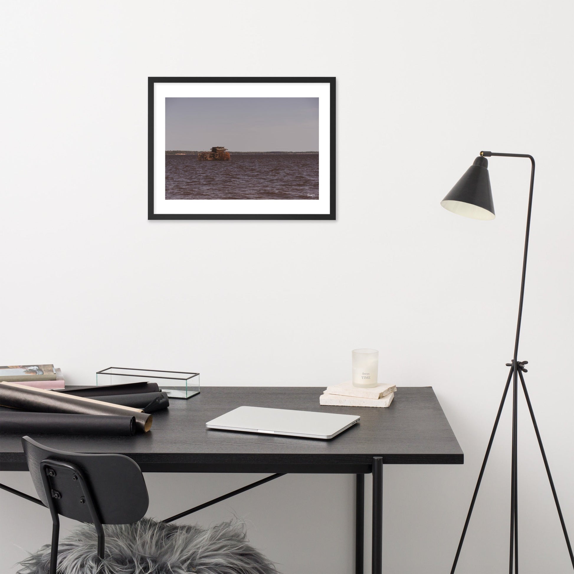Overwatch presents a solitary waterblind anchored in the middle of a vast, open river—an image of still resolve amidst an expanse of movement. The muted earth tones and gentle haze evoke the quiet patience of observation, lending a quiet power to the isolation of the structure. This print draws the eye with its contrast between manmade utility and untamed water, making it a striking piece for interiors that value raw minimalism and contemplative space.